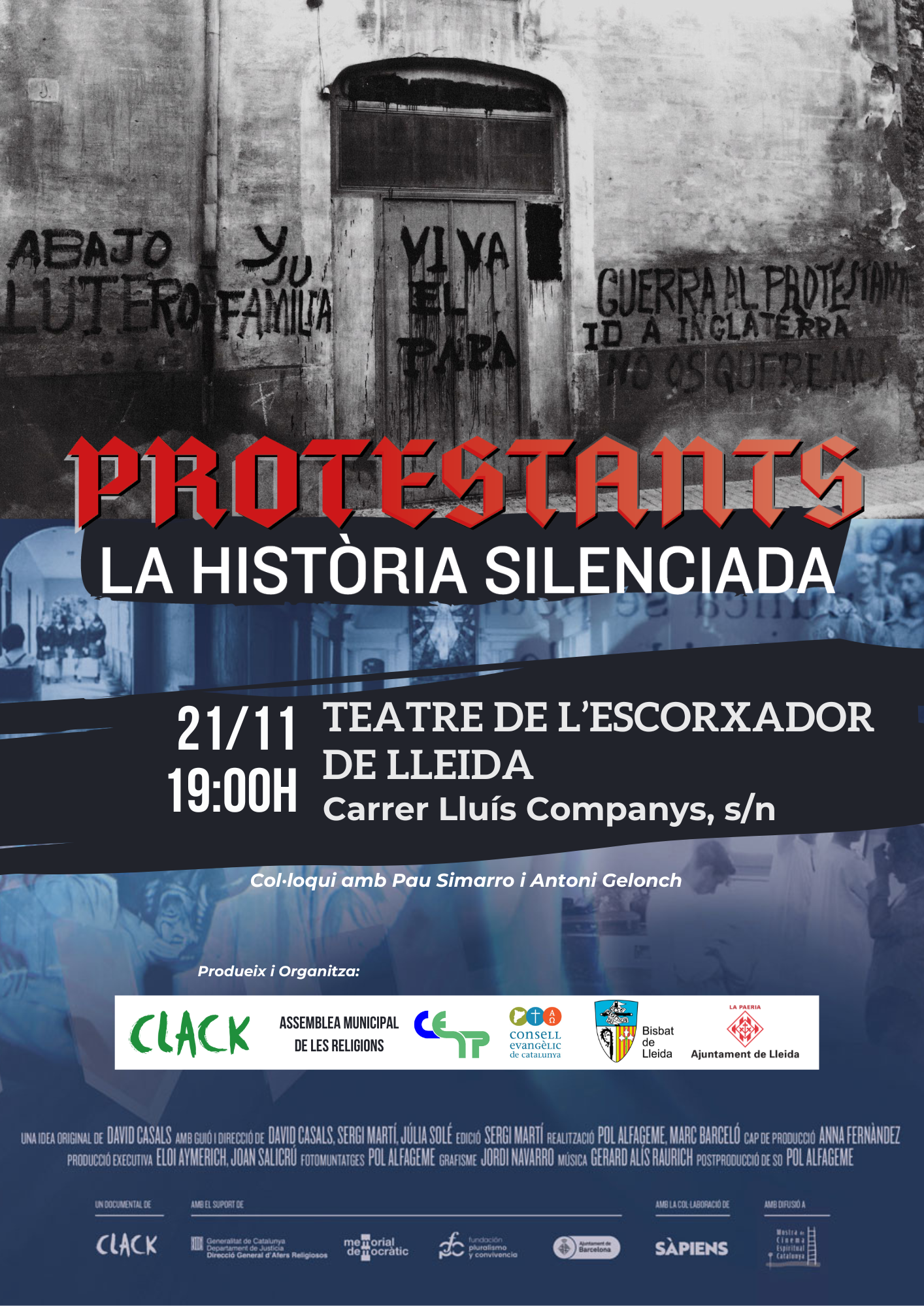 El 21 de novembre, al Teatre de l'Escorxador de Lleida, el Consell Evangèlic de Ponent i el Bisbat de Lleida, i membres de l’Assemblea Municipal de les Religions vam poder gaudir del passi del documental “Protestants. La història silenciada”, que tracta sobre la dura repressió que va viure el protestantisme durant el règim del dictador Franco, especialment, en el període posterior a la Guerra Civil.