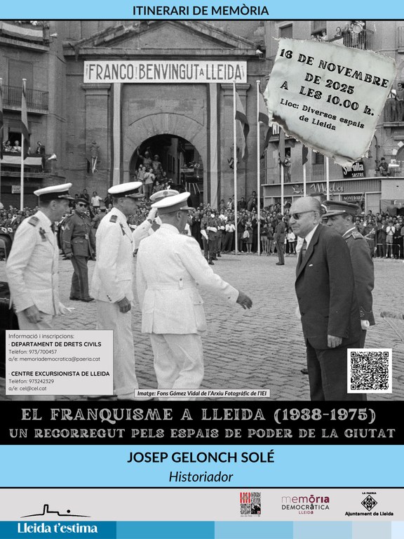 A través d’un recorregut pels principals espais de poder polític del franquisme, Josep Gelonch Solé, historiador expert en el franquisme a les terres de Lleida, ens oferirà una mirada crítica i documentada sobre com es va estructurar el poder dictatorial a la ciutat, quines van ser les seves bases socials i polítiques, i com es va mantenir durant gairebé quatre dècades.