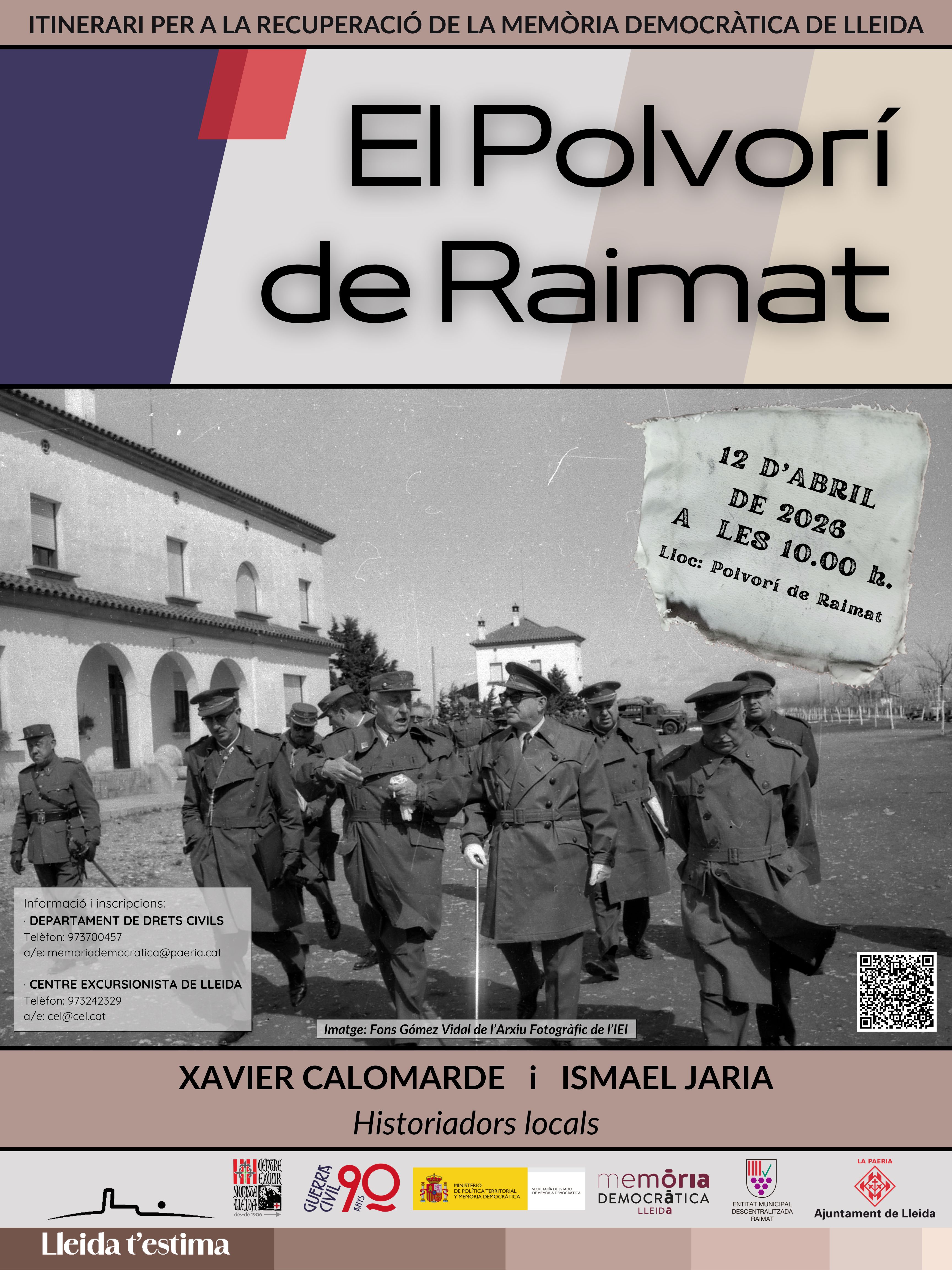 Aquesta edició estarà dedicada monogràficament al Polvorí de Raimat, un espai clau en l’estratègia militar republicana durant la Guerra Civil i, alhora, un element patrimonial de primer ordre. L’itinerari serà conduït per Xavier Calomarde i Ismael Jaria, dos veïns de Raimat que han estudiat profundament el passat agrícola, social i bèl·lic del poble, i que han contribuït decisivament a documentar i difondre la seva memòria.