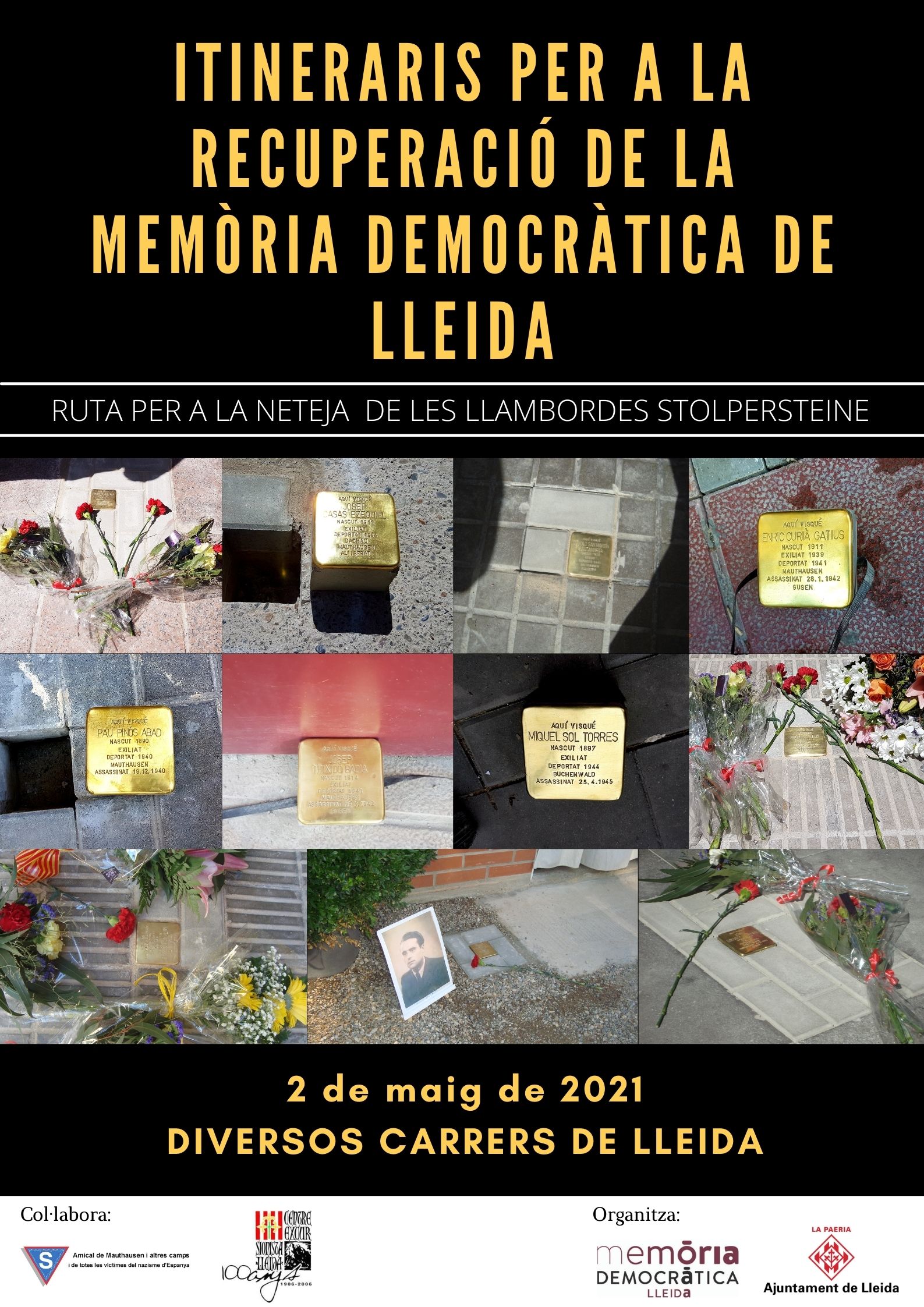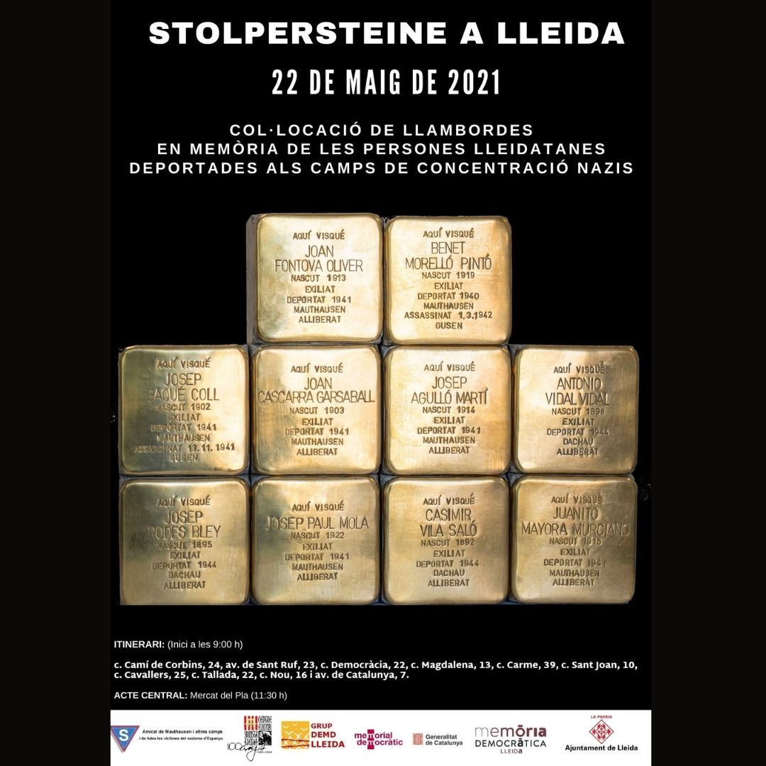 L’any 2019 es varen col·locar 11 llambordes Stolpersteine a la ciutat de Lleida en homenatge persones de la nostra ciutat que van ser deportats a diversos camps de concentració nazis Aquestes peces a l’estar col·locades al carrer pateixen un procés de desgast i deteriorament i per això, de manera periòdica, s’ha de fer una tasca de neteja. Aprofitant que durant el mes de maig de 2021 es col·locaran 10 llambordes més a la nostra ciutat, el pròxim 2 de maig es farà un Itinerari per a la Recuperació de la Memòria Democràtica amb un caràcter molt especial. Memòria Democràtica juntament amb el Grup de Recuperació de Memòria Històrica del Centre Excursionista de Lleida i l’Amical de Mauthausen faran un recorregut per les diverses llambordes col·locades l’any 2019, realitzant una neteja a fons d’aquestes peces i recordant les persones que van ser homenatjades. Aquest acte començarà al carrer Martí Gralla i acabarà al carrer Canonge Brugulat.