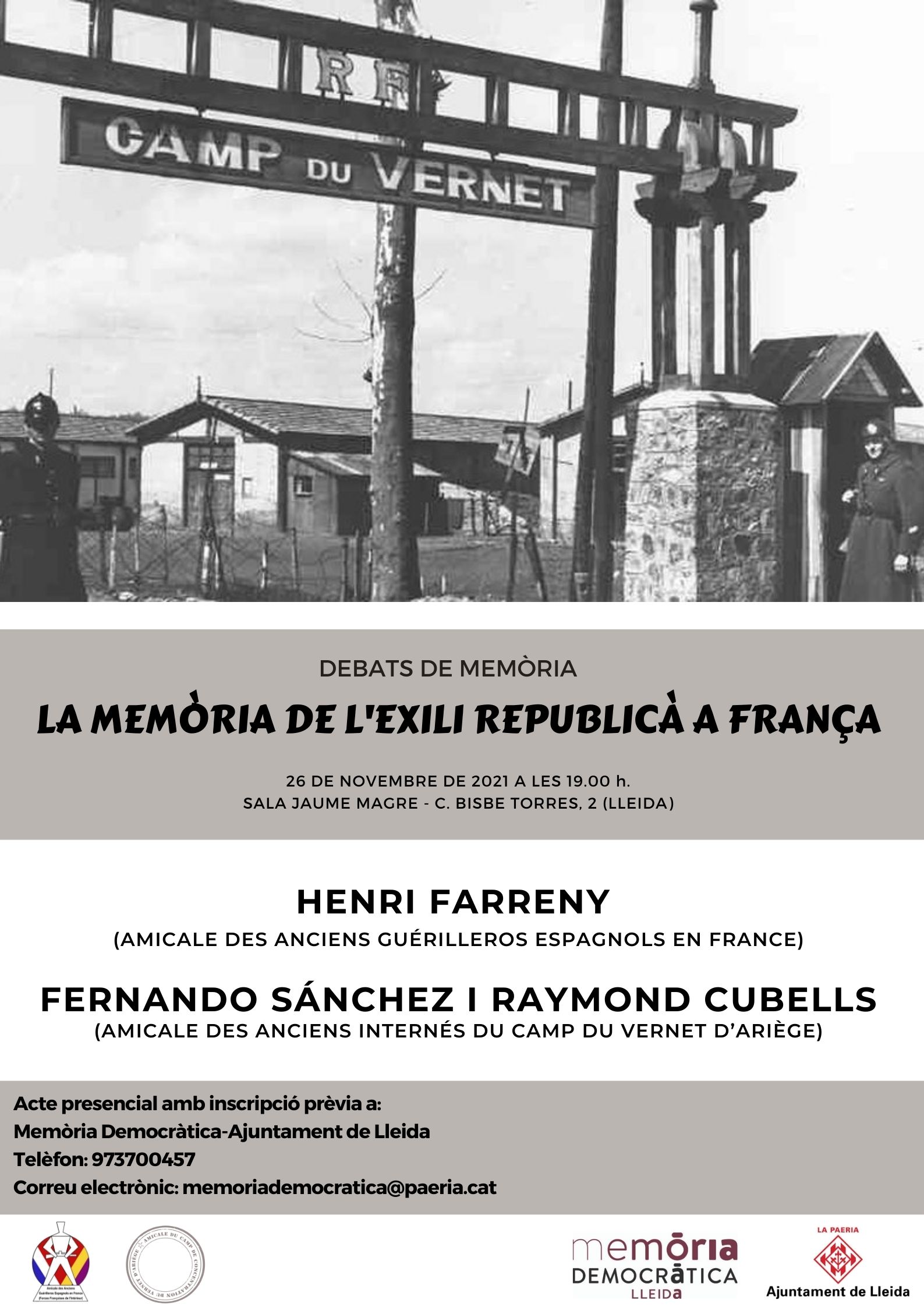 La conferència serà a càrrec d’Henri Farreny, President de l'Amicale des Anciens Guérilleros Espagnols a France-Forces Françaises de l'Intérieur (AAGEF-FFI) i Raymond Cubells i Fernando Sánchez membres l’Amicale des Anciens Internés du camp du Vernet d’Ariège.