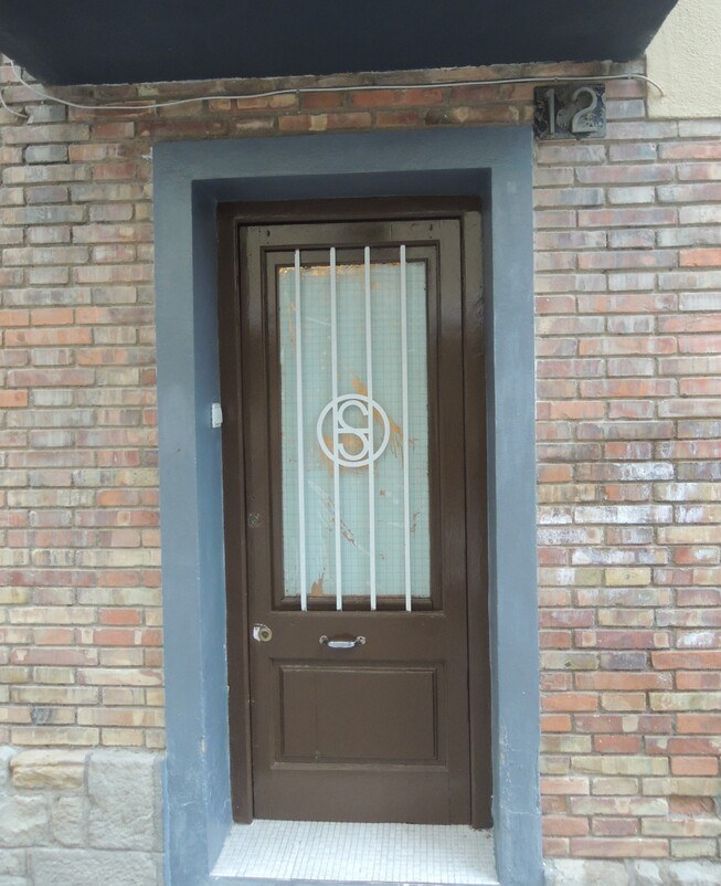 La porta d'accés a una casa particular amb l'emblema de l'Obra Sindical del Hogar.
