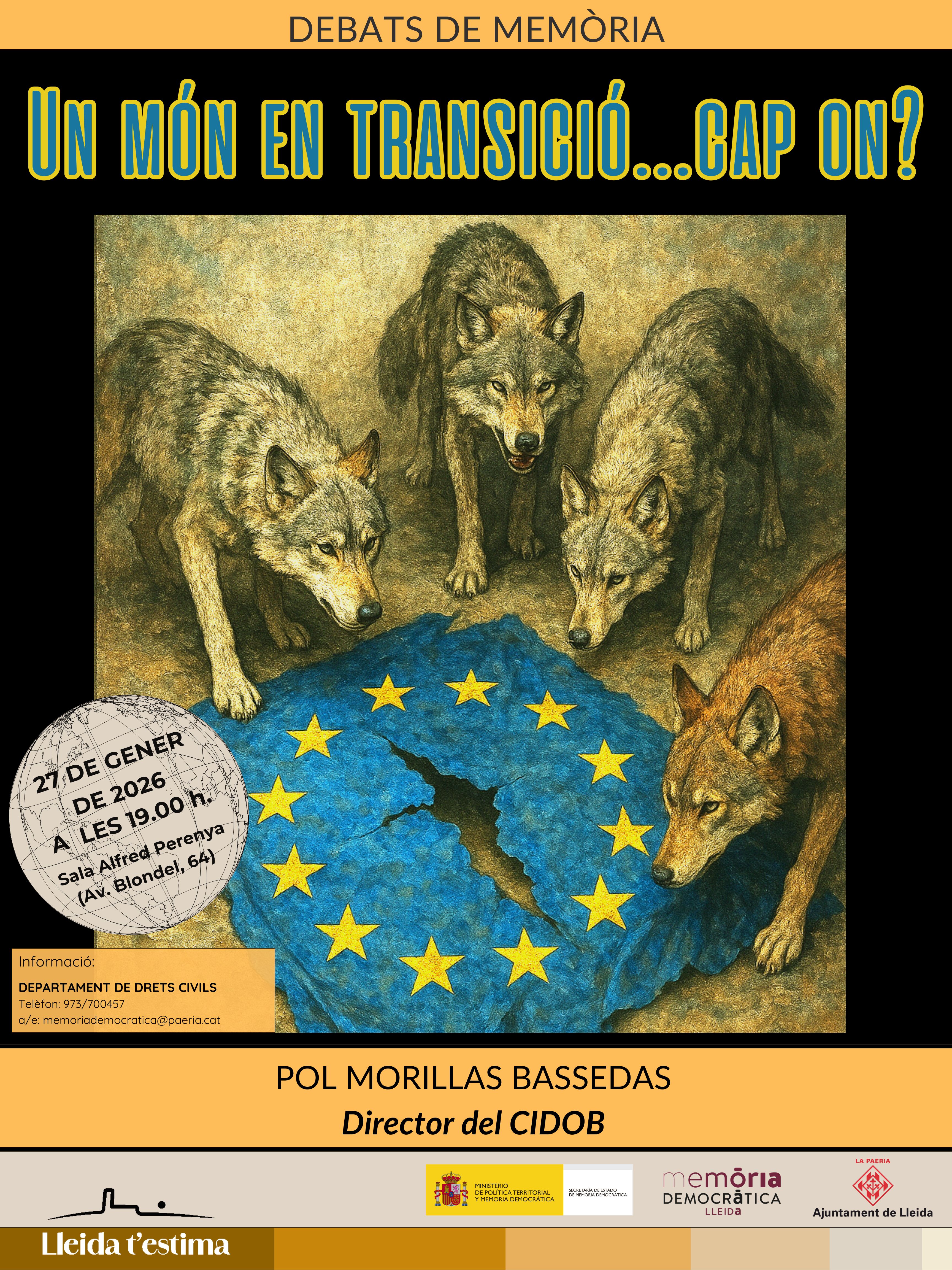 La Regidoria de Drets Civils va celebrar el dimarts 27 de gener de 2026 una nova sessió dels Debats de Memòria amb la conferència “Un món en transició... cap on?”, a càrrec de Pol Morillas Bassedas, director del Barcelona Centre for International Affairs (CIDOB). L’acte es va dur a terme a la Sala Alfred Perenya i va reunir unes 85 persones.